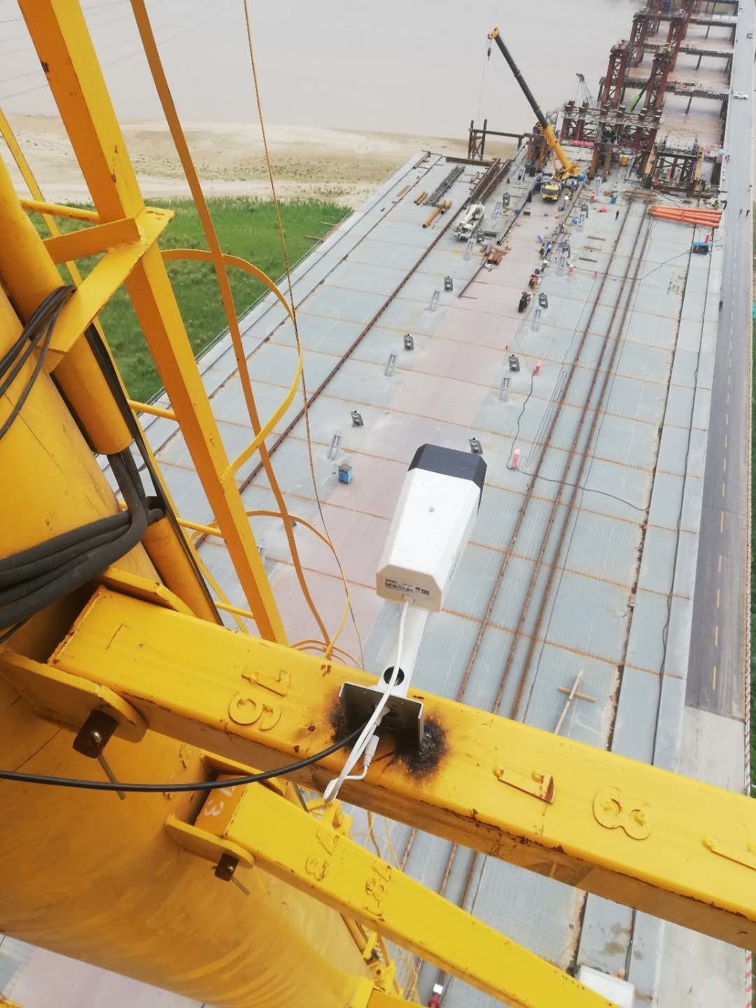3. 龍門吊高度53米,跨度32米,為齊魯黃河大橋施工主要裝備,設(shè)備架設(shè)在黃河橋上,設(shè)備最高處距離黃河水面近80米,設(shè)備安全運(yùn)行,對(duì)項(xiàng)目進(jìn)度起到至關(guān)重要的作用,鄭州愷德爾遠(yuǎn)程監(jiān)控系統(tǒng)的安裝,為該設(shè)備正常運(yùn)行提供了可靠保障。
